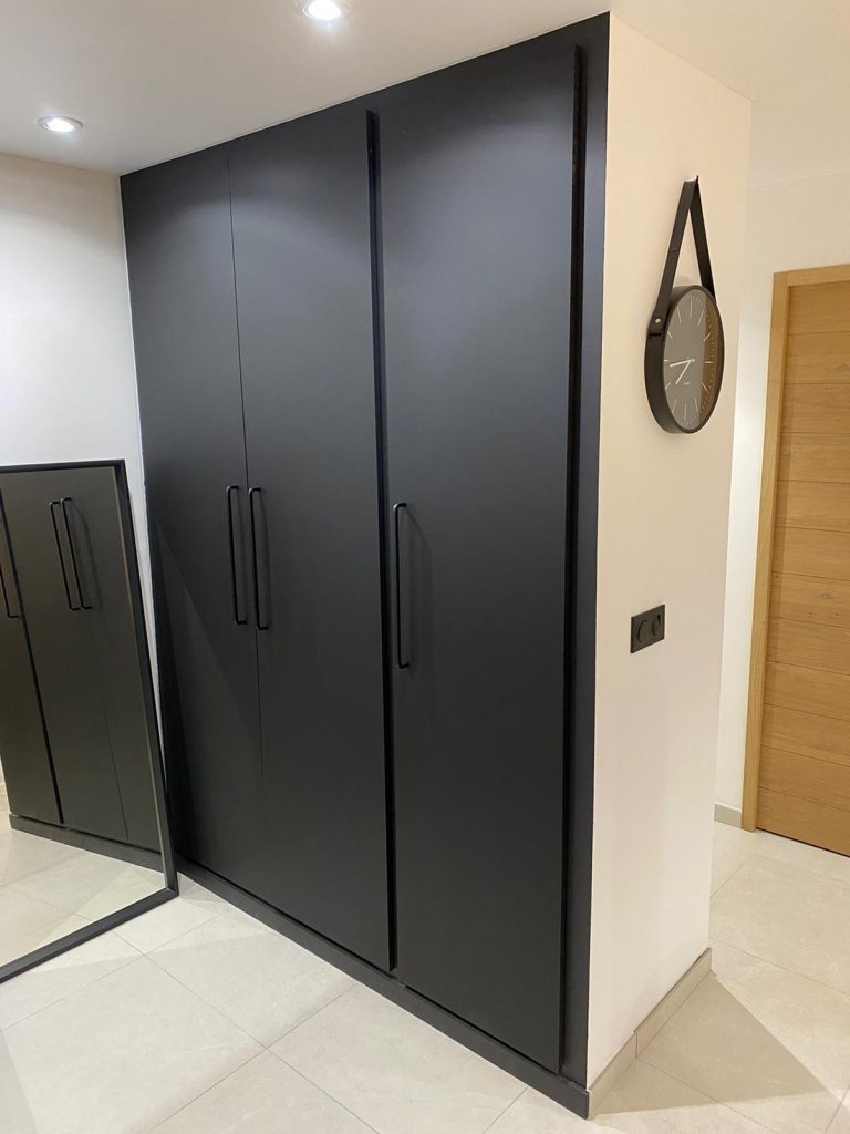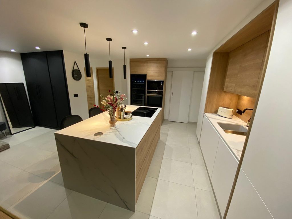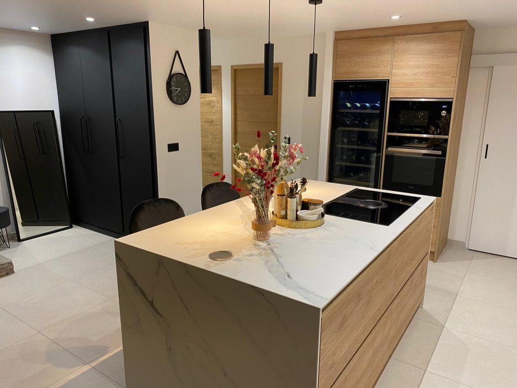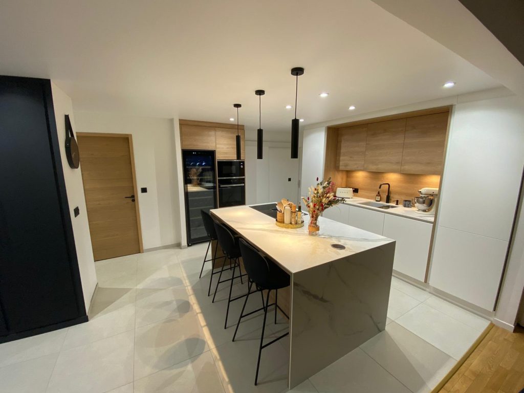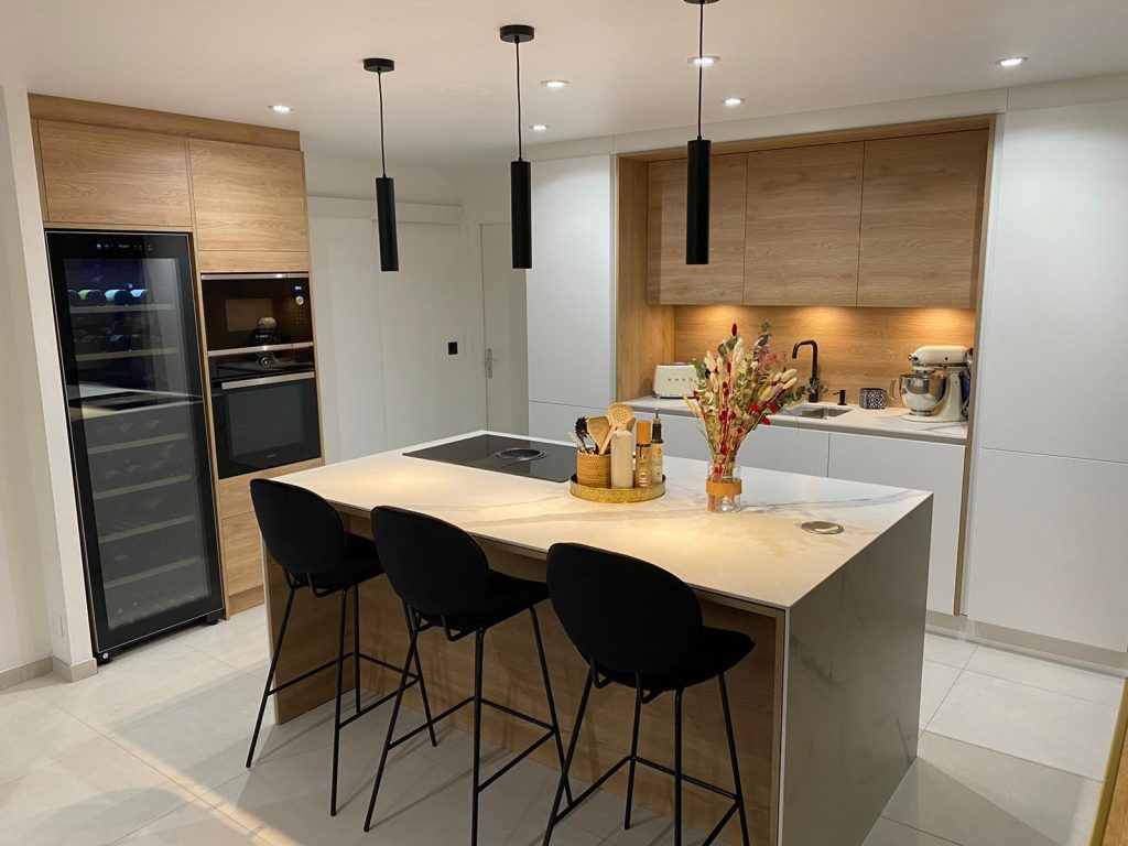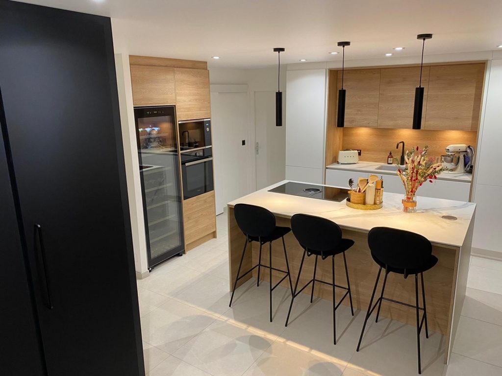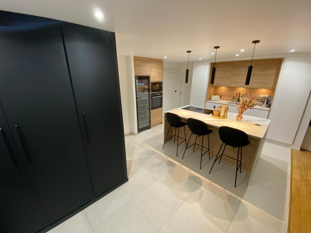 Grand placard sur mesure en laque noir mat en accord avec la cuisine. La cuisine est en laque blanc mat sans poignée mélangé avec le bois creta et sa céramique Aria White mat. Elle se compose d’une plaque de cuisson Elica avec sa hotte intégrée, d’une cave à vin grande contenance Sommelière. Les meubles allant jusqu’au plafond donne un ensemble élégant, le plafond qui est un plafond tendu mat qui la rend d’autant plus contemporaine. Le coin repas est intégré dans l’ilot avec le jambage en céramique et son fond en bois.