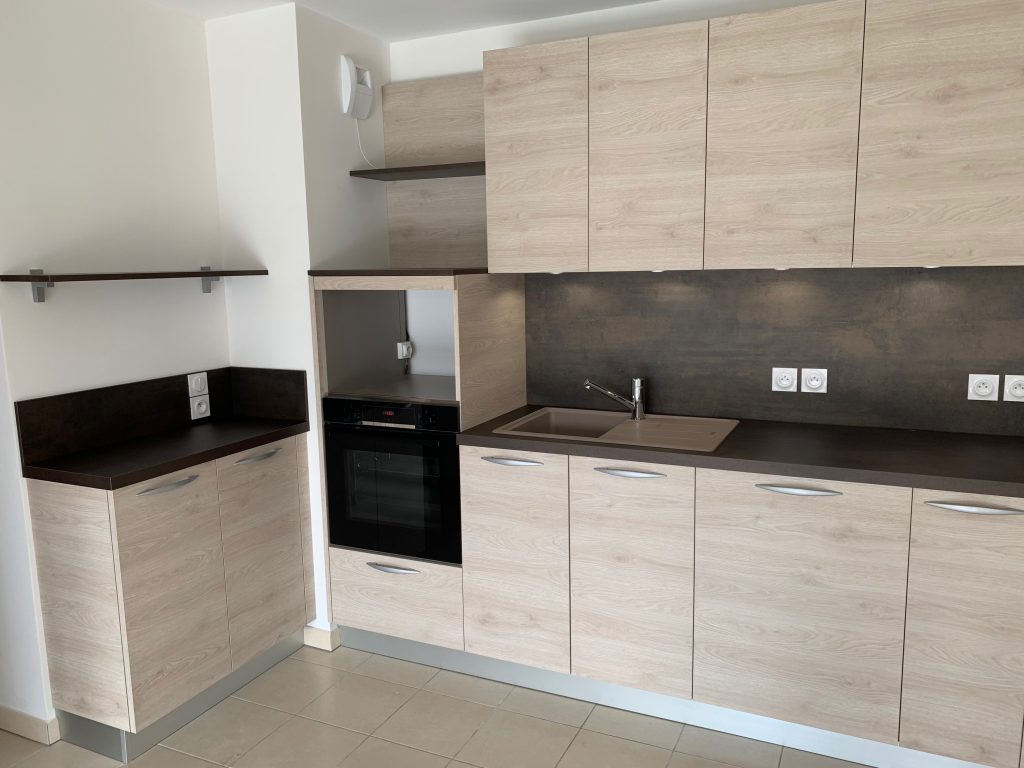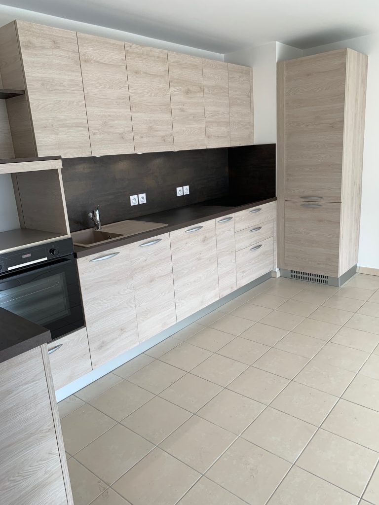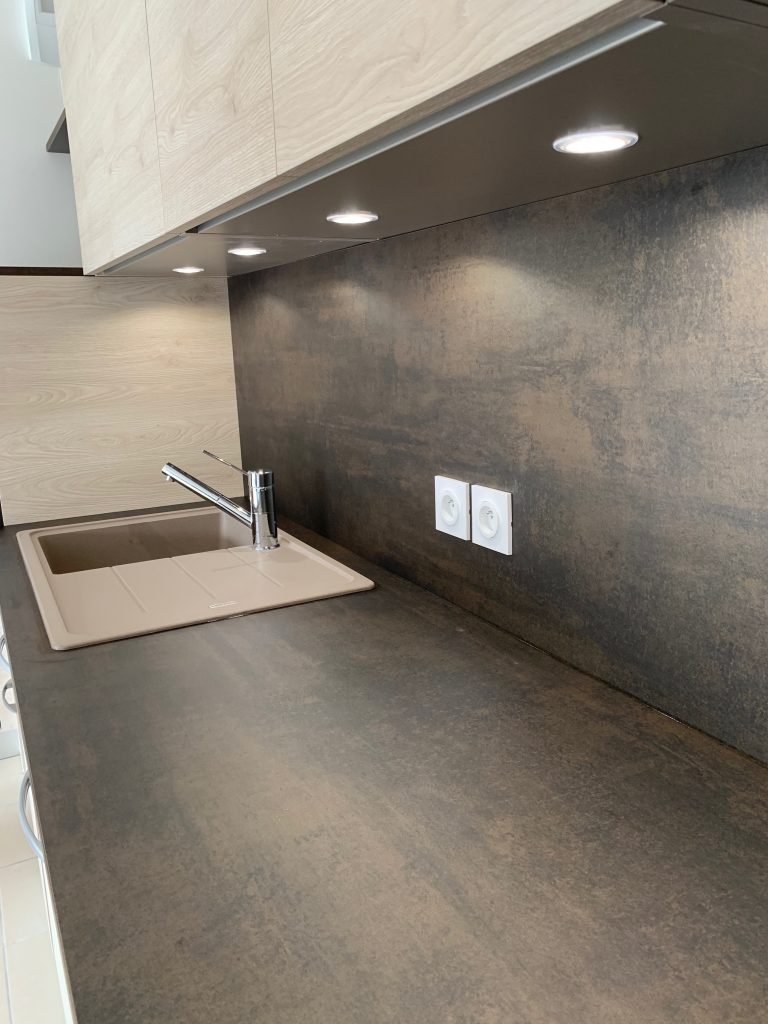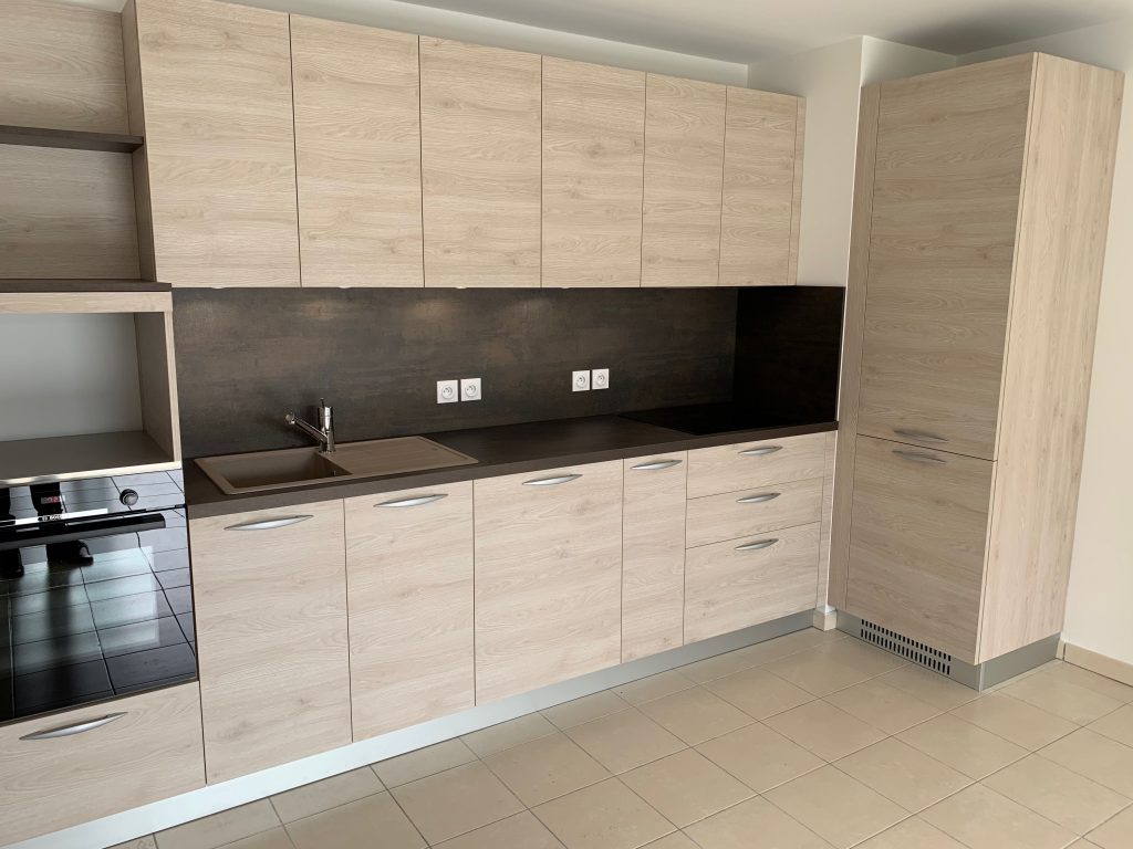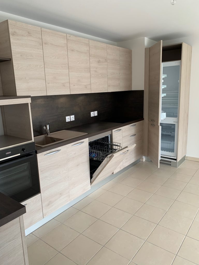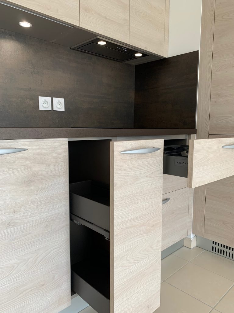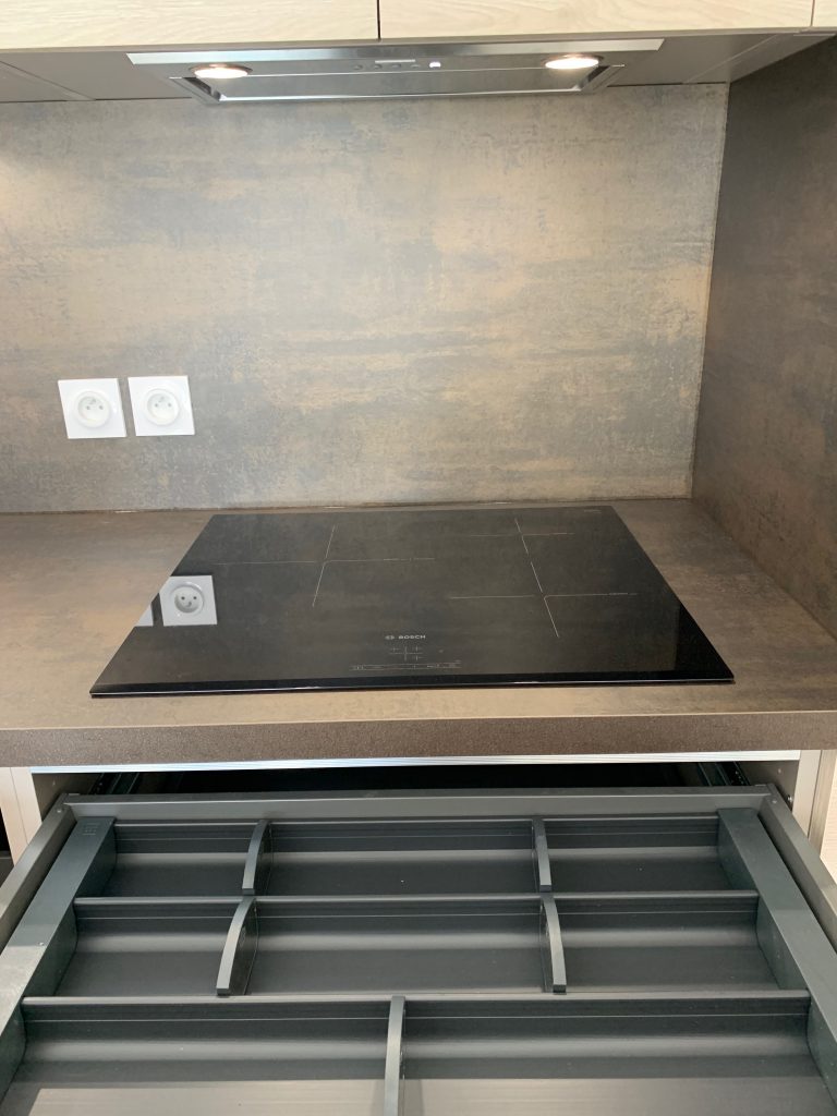 Cuisine destinée à la location, totalement équipé par des électroménagers Bosch. La crédence et le plan de travail en stratifié hydrofuge apportent du contraste avec les façades qui elles sont en bois clair.