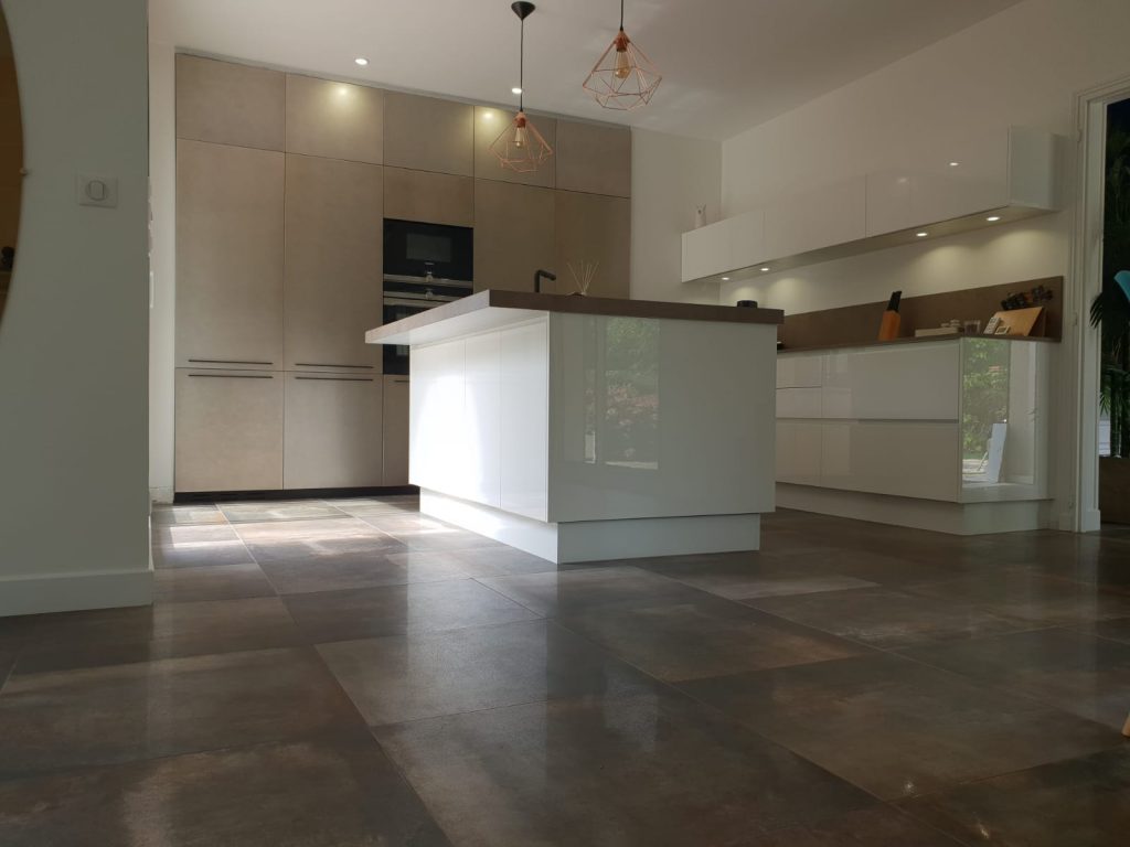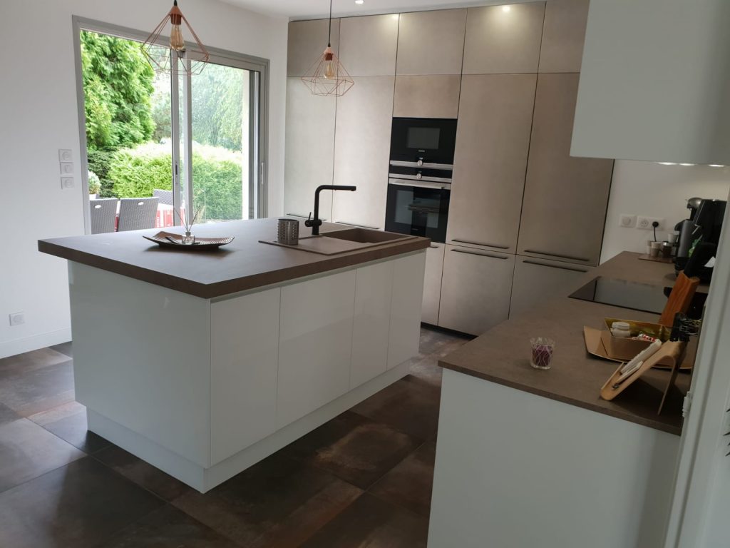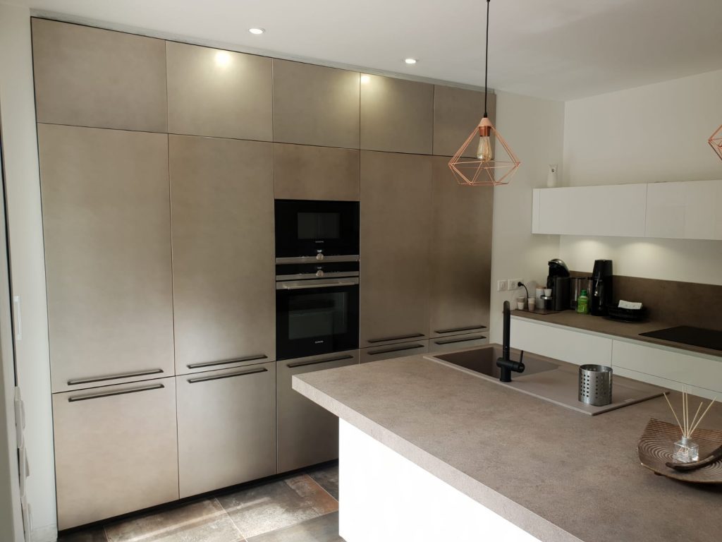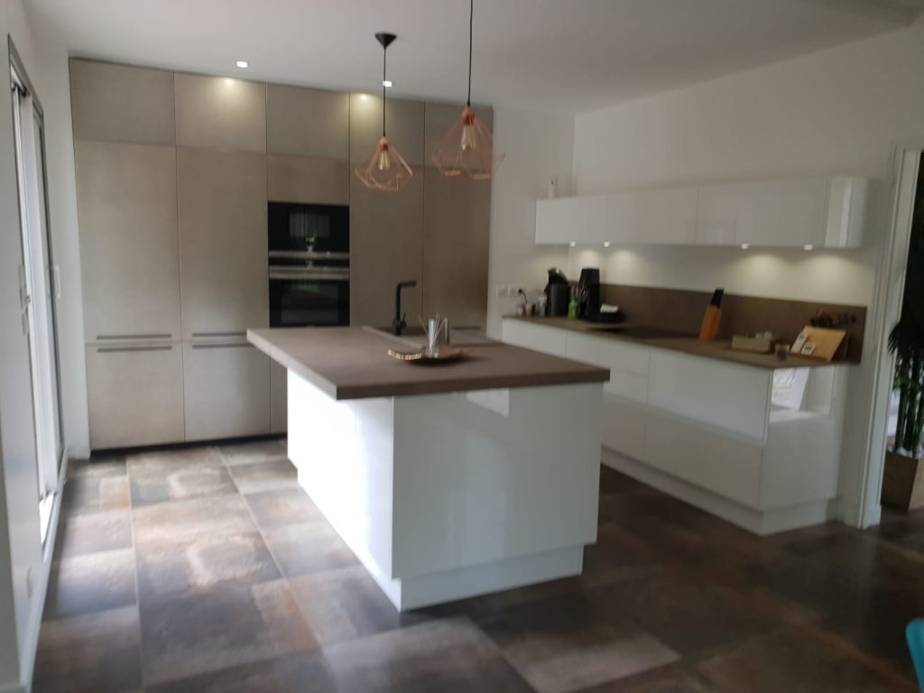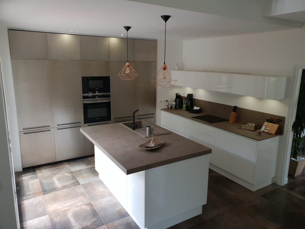 Produit d’exception – Les meubles bas en laqués blanc brillant laissent la place à ce magnifique mur de colonnes en véritable laque satiné urban. Le plan de travail en stratifié beige se coordonne avec le coloris du carrelage.