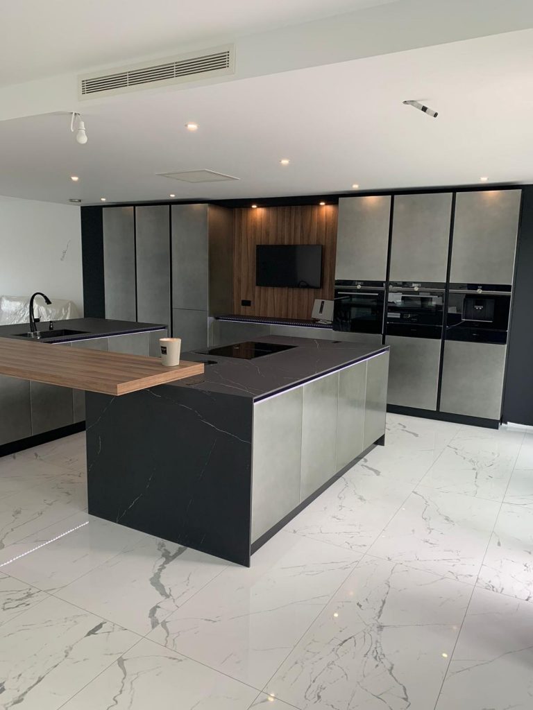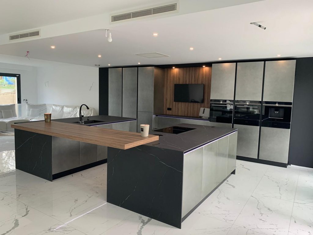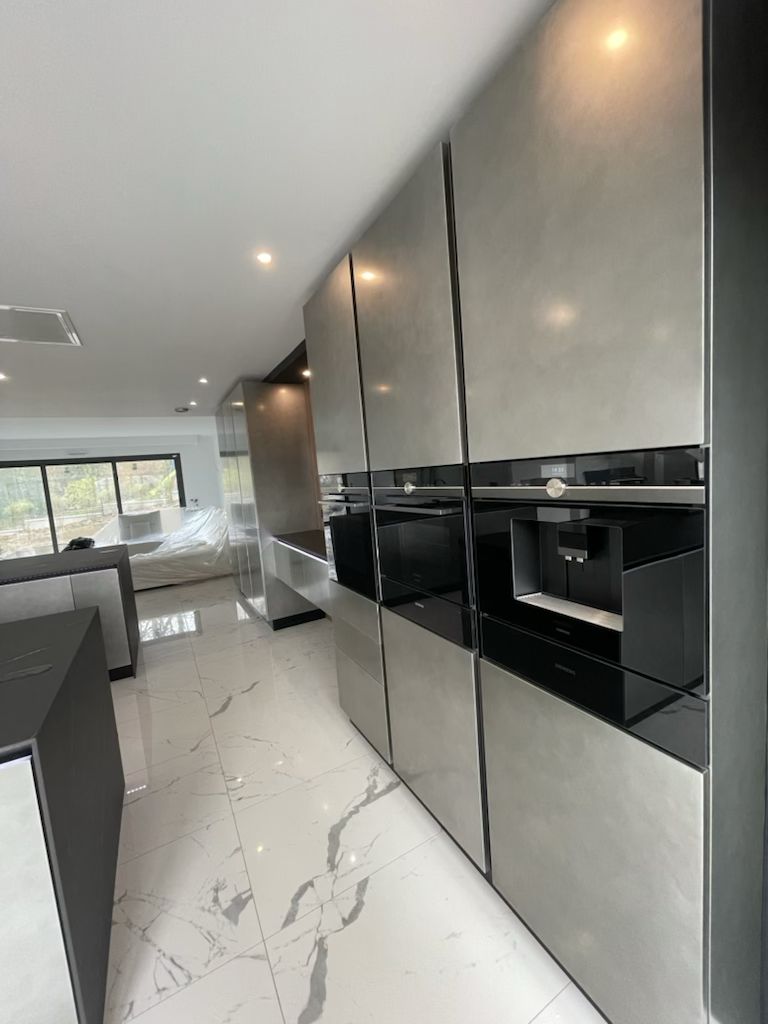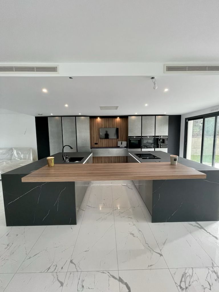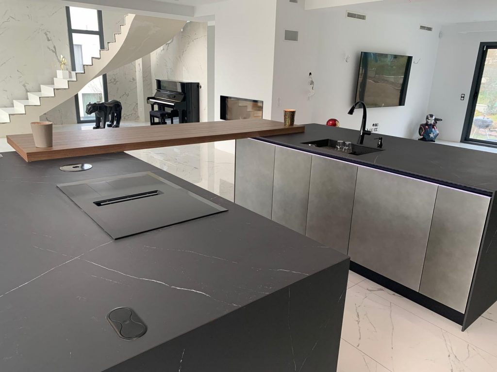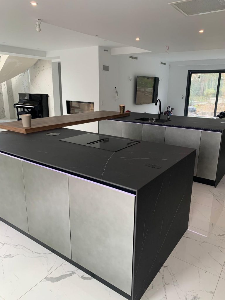 Dans une magnifique villa cette cuisine luxueuse possède des façades composé de 75% de métal liquide coloris inox. Les plans de travail et jambages sont en céramique veiné qui encadrent et posent les 2 ilots qui compose cette cuisine. L’un pour l’évier, l’autre pour la cuisson avec la hotte intégrer dans la plaque. Du bois en noyer canaletto derrière la télé et au niveau du coin snack apportent chaleur et harmonie dans cette grande pièce. Le mitigeur design en bec de signe est la cerise sur le gâteau. Des prises de plan, une poubelle de plan, un porte savon, des tiroirs avec des remontés en verre, une machine à café intégré, un four vapeur, sont autant de d’accessoires qui conclu cette cuisine exceptionnelle.