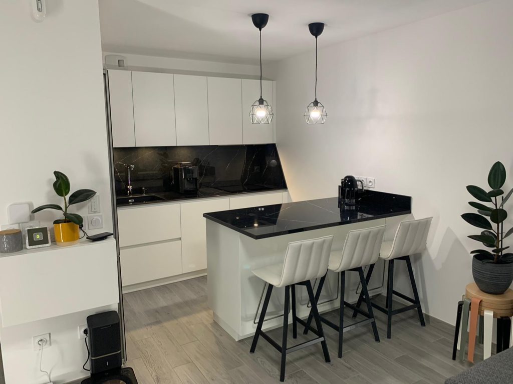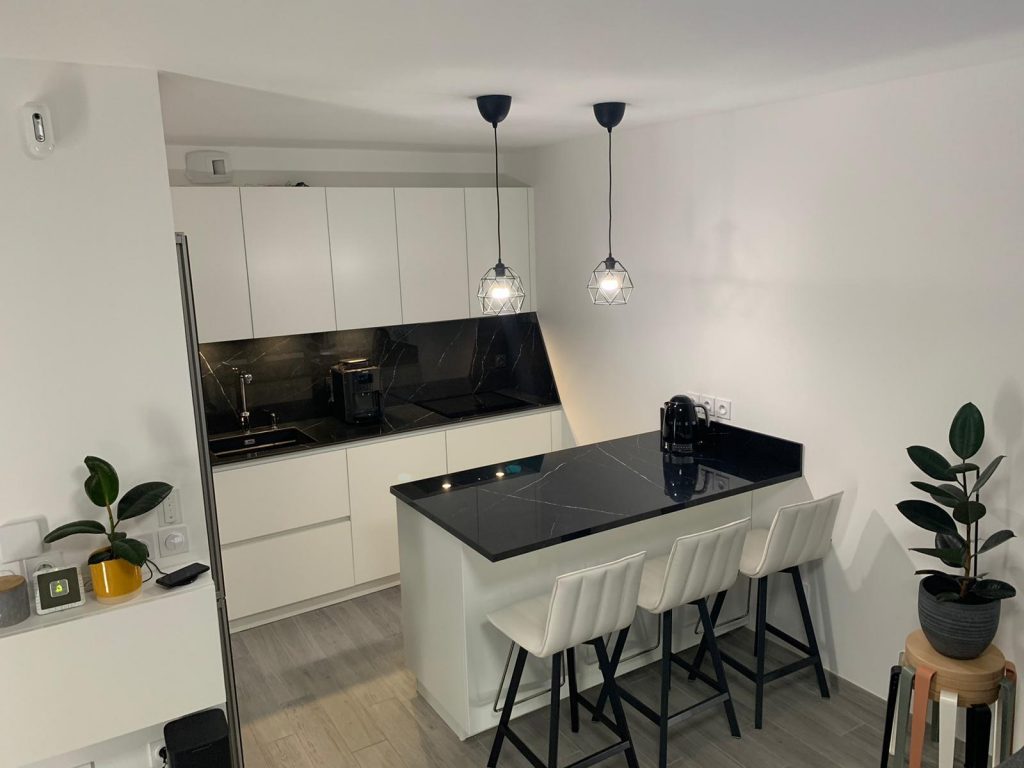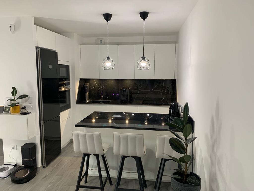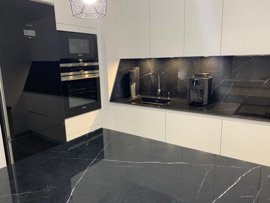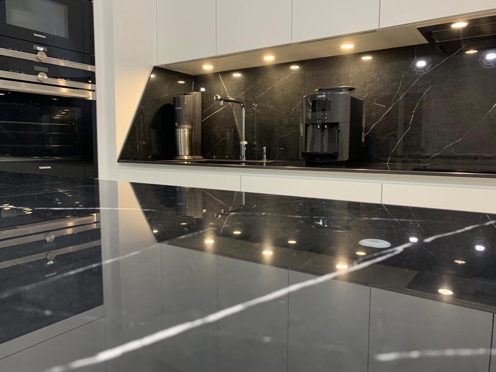Magnifique pièce de vie avec son coin salon – la table basse en bois Kaos et le meuble tv en laque blanc brillant et bois Kaos et le coin cuisine en laqué blanc mat avec un plan de travail en céramique Liem black brillant. Les électroménagers de coloris noir siemens et le réfrigérateur en verre noir s’intègrent parfaitement dans cette pièce de vie chaleureuse et harmonieuse.