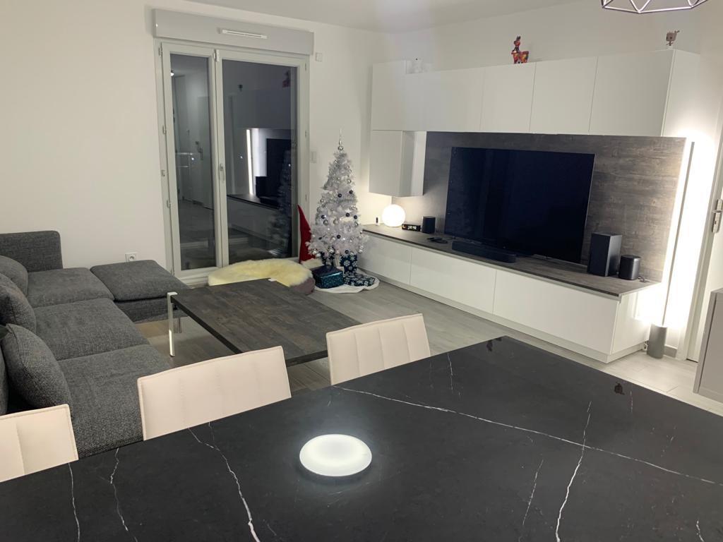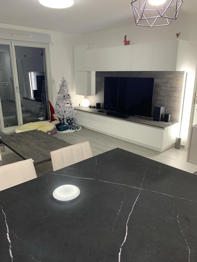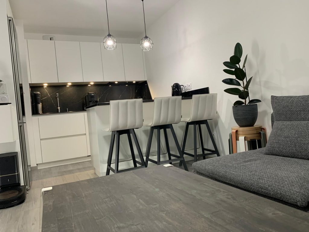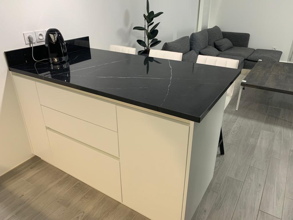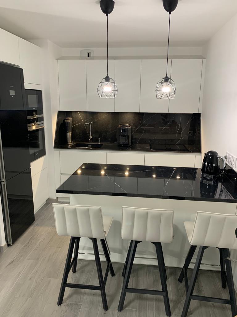 Magnifique pièce de vie avec son coin salon – la table basse en bois Kaos et le meuble tv en laque blanc brillant et bois Kaos et le coin cuisine en laqué blanc mat avec un plan de travail en céramique Liem black brillant. Les électroménagers de coloris noir siemens et le réfrigérateur en verre noir s’intègrent parfaitement dans cette pièce de vie chaleureuse et harmonieuse.