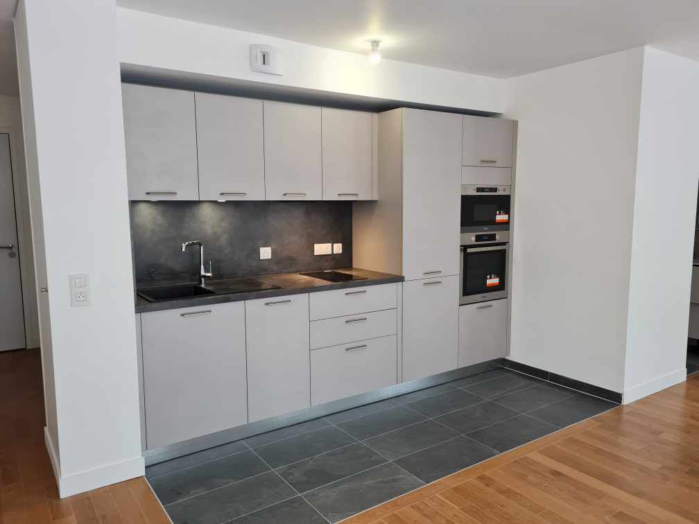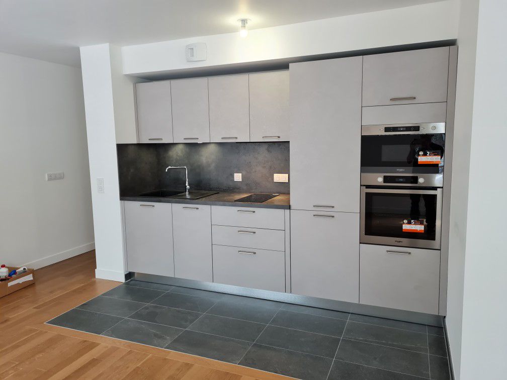 Dans le marais, bel appartement destiné à la location. Cuisine moderne avec des façades style béton gris avec plans de travail et crédence en stratifié gris anthracite. Dans cette espace se trouve un lave vaisselle, une plaque de cuisson, une hotte, un réfrigérateur, un four et un micro-onde.