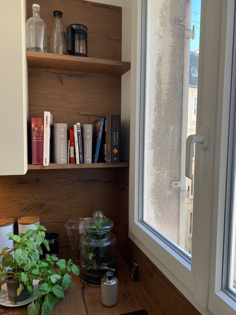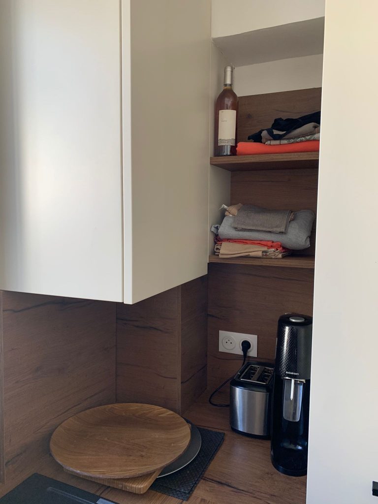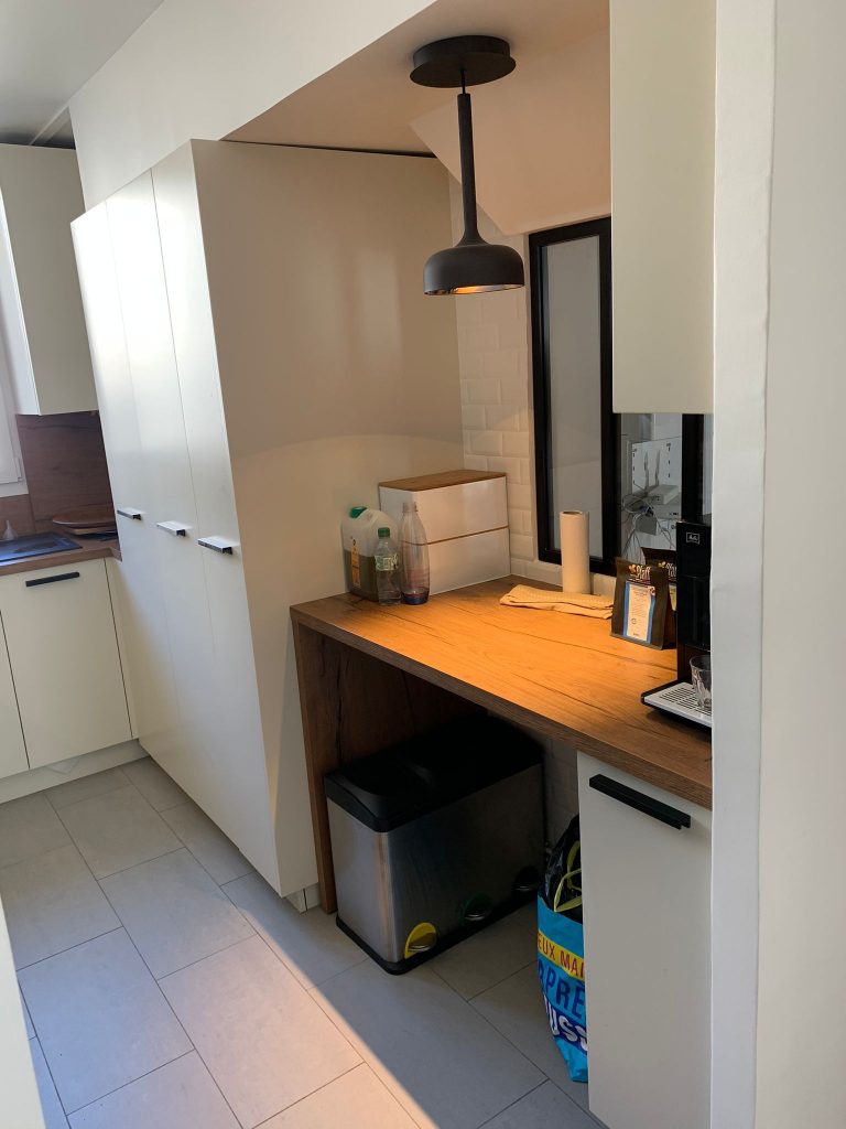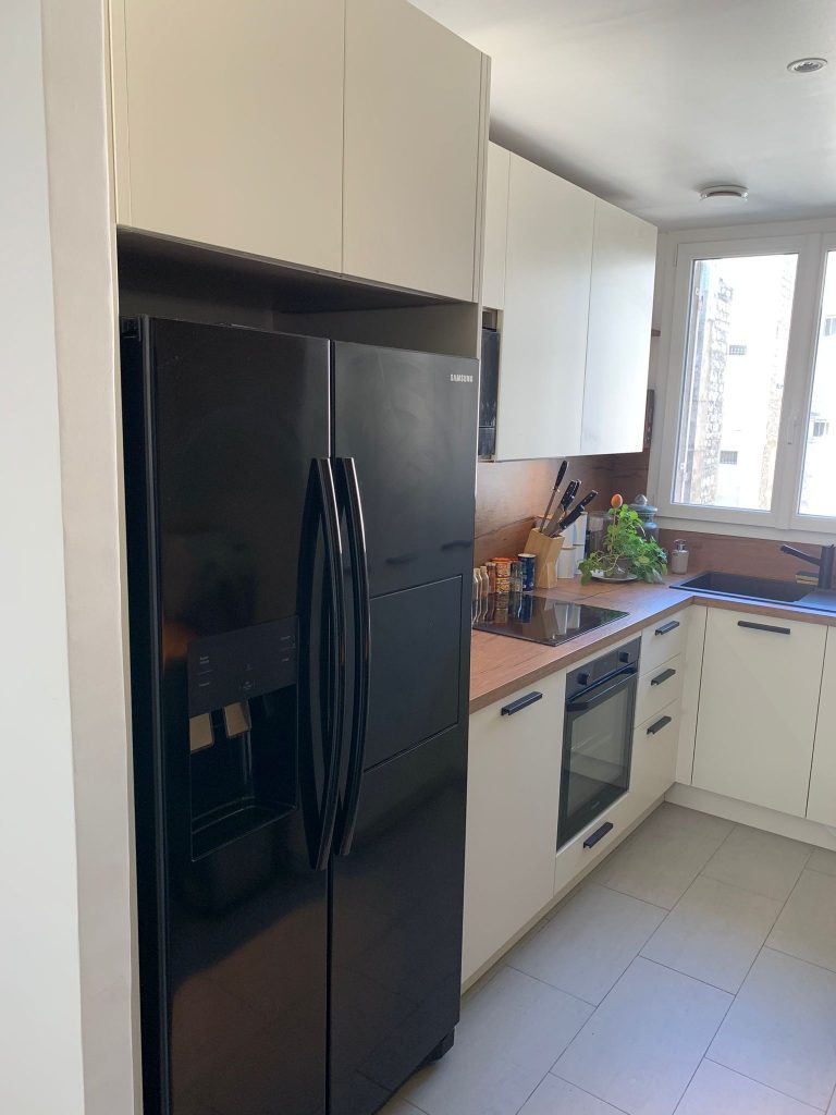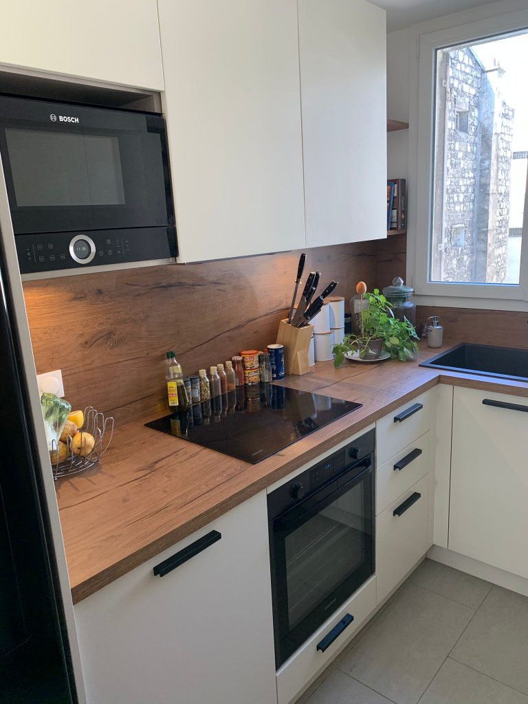 C’est au niveau de la place de la nation que cette cuisine fonctionnelle et conviviale y trouve sa place. De coloris lin mat cette cuisine et souligné par le plan de travail et la crédence en bois brun et accessoirisé de noir avec les électroménagers et poignées.