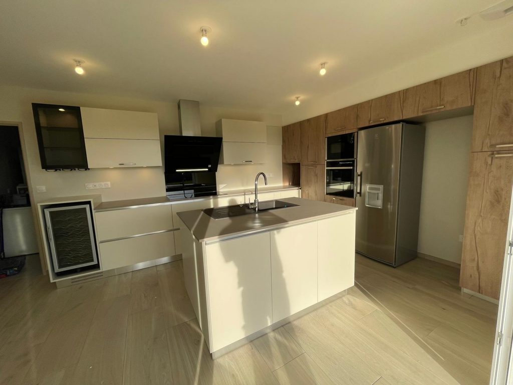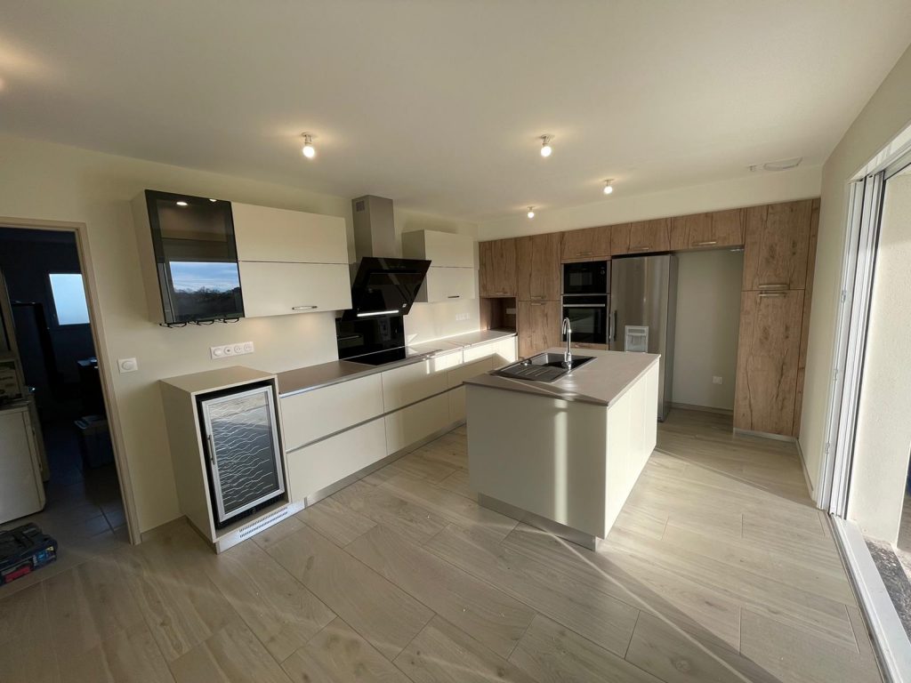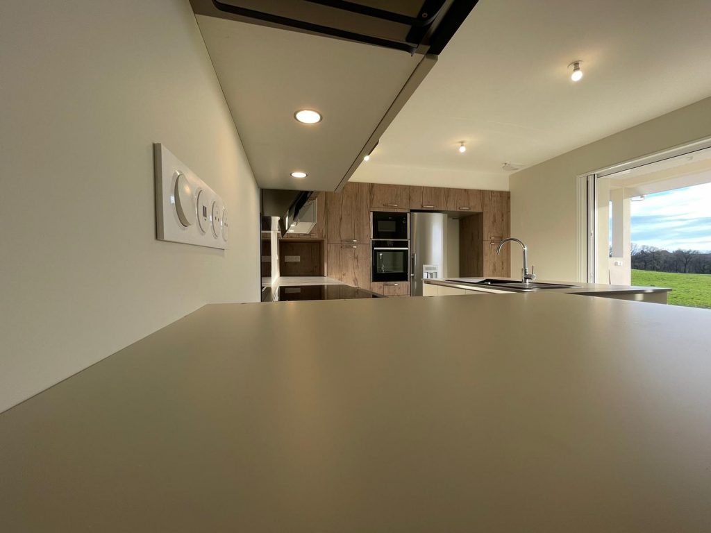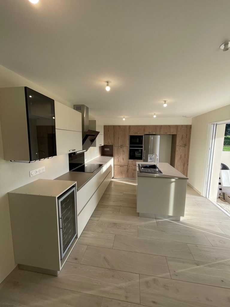 Implanté dans le sud de la France, cette belle cuisine avec un mur de colonne en bois veiné, un ilot et linéaire en lin laque mat et un plan de travail en Silestone quartz taupe permet d’intégrer a merveille ces appareils ménagers. Un coin à été aménagé avec la cave à vin, un meuble vitrine au dessus et des portes verres à vin sous le meuble.